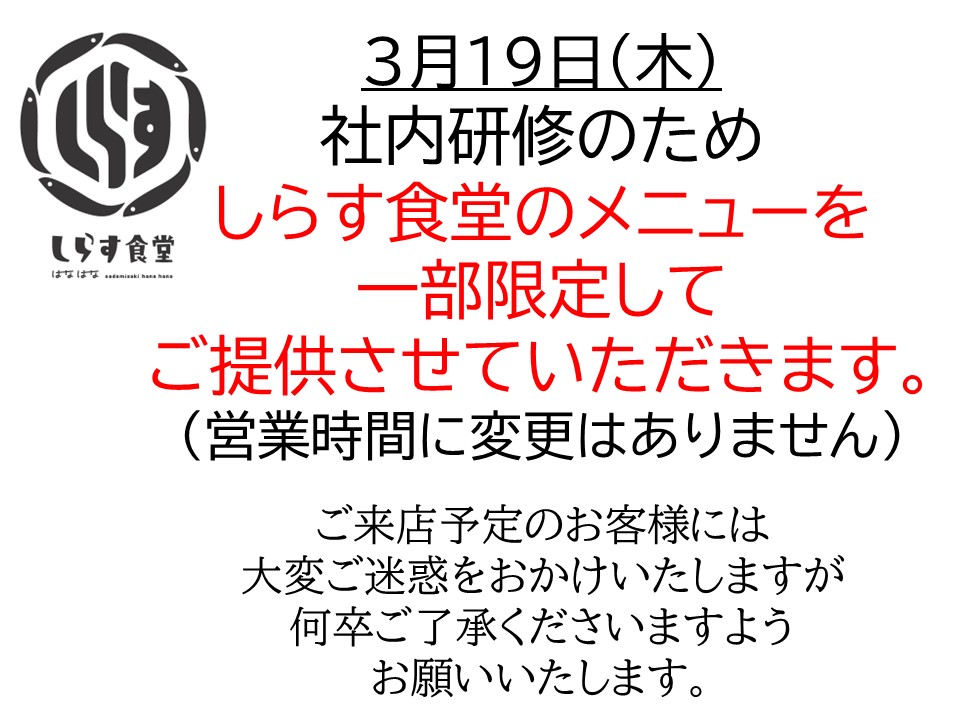 26.03.19 社内研修のため 食堂一部メニューをお休みします 2026年03月16日 3月19日(木)社内研修のため 食堂のメニューを一部、お休みさせていただきます。 営業時間は通常通りです。 ご来店予定のお客様には大変ご迷惑をおかけいたしますが 何卒ご了承くださいますようお願いいたします。 Lineで送る シェアする